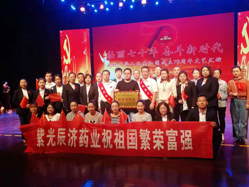 为隆重纪念中华人民共和国成立70周年,讴歌伟大祖国所取得的辉煌成就,宝鸡市金台区非公有制经济组织委员会于9月27日下午3时在宝鸡烟厂俱乐部召开“壮丽70年、奋斗新时代”庆祝中华人民共和国成立70周年文艺汇演暨表彰大会,区非公经济组织基层党支部、区直机关、社会组织共计五百余人参加了本次大会。 为表彰先进,弘扬模范精神,金台区非公党委表彰了为区经济社会发展做出突出贡献的集体和个人,紫光辰济药业荣获优秀组织奖,我司工会主席李继虎、党员张晓辉荣获“最美奋斗者”荣誉称号。 我司选送的诗歌朗诵《共和国礼赞》,与现场观众一起共抒爱国情怀、共话祖国新貌讴歌了伟大祖国的丰功伟绩,赢得阵阵掌声!选派的8位礼仪,也为此次表彰大会也做出了突出贡献! 紫光辰济药业党总支将全力以赴围绕经营充分做好党建工作,带领公司全体人员团结一致、锐意进取,追赶超越,增强“绝对忠诚、紧跟党走”的坚定信念,培养出更多的优秀人才,为伟大祖国贡献力量,为紫光辰济药业增光添彩!